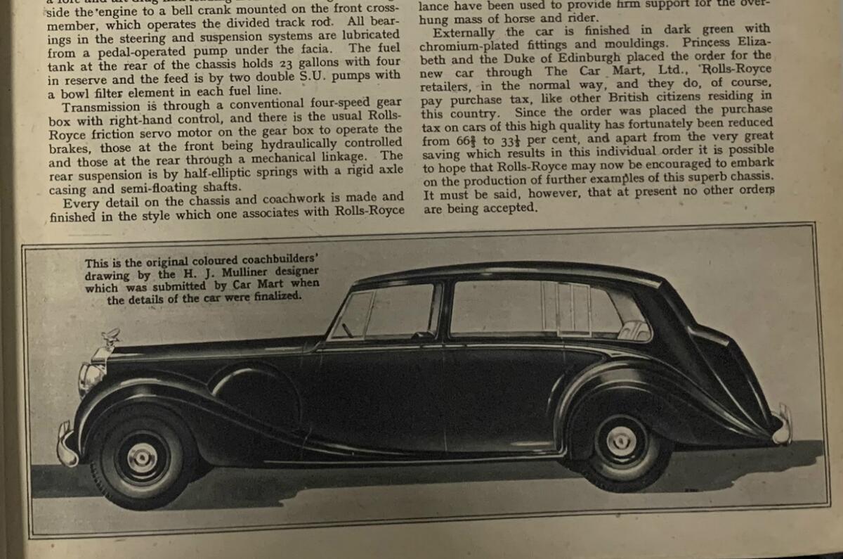 Autocar reported details of the car on 7 July 1950, saying that while Rolls-Royce had longstanding relationships with high society, this was "the first time that a completely new model has been evolved specially for members of the British Royal House".