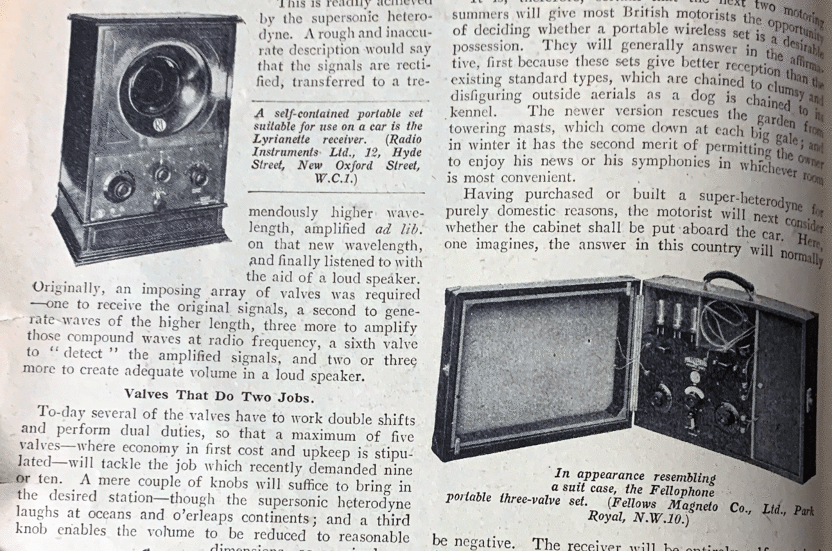It's no surprise, then, that wireless expert BH Davies wrote in a popularly received Autocar article in March 1925 that "at first sight, the only natural link between motoring and wireless is that both are semi-technical hobbies, the pursuit of which does not necessarily demand a long apprenticeship to engineering, or, indeed, anything beyond a rule-of-thumb knack of handling controls, the purpose of which is vaguely comprehended".