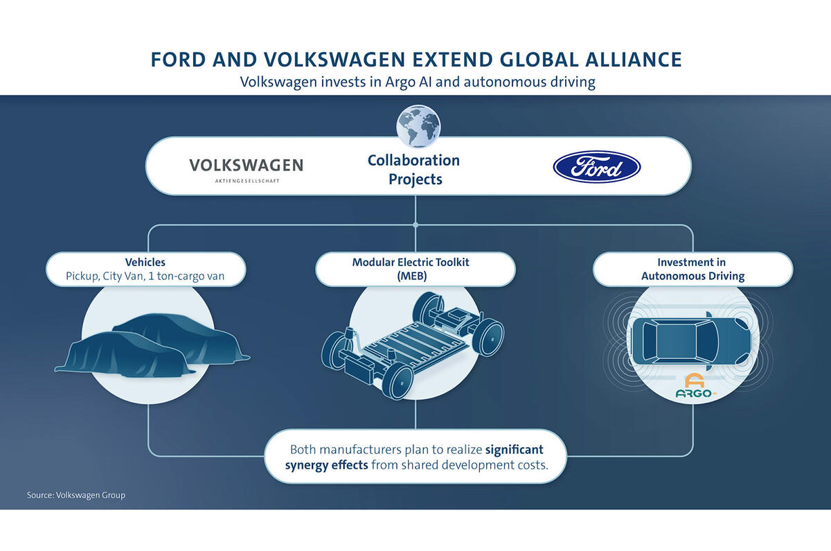 In a joint release, Ford and Volkswagen said that their alliance will help them to “meet rapidly evolving needs of their respective customers in Europe and other regions by leveraging complementary strengths in mid-size pick-up trucks and commercial and electric vehicles”.