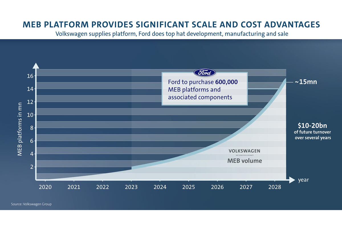 The two firms estimate that Ford “could deliver 600,000 electric vehicles atop the MEB architecture”, with Volkswagen saying the deal is “another cornerstone” in its EV strategy. While the MEB platform will underpin a range of EVs from Volkswagen, Seat, Skoda and Audi, it was also developed to enable it to be licensed to partner firms, helping the Volkswagen Group to achieve better economies of scale.