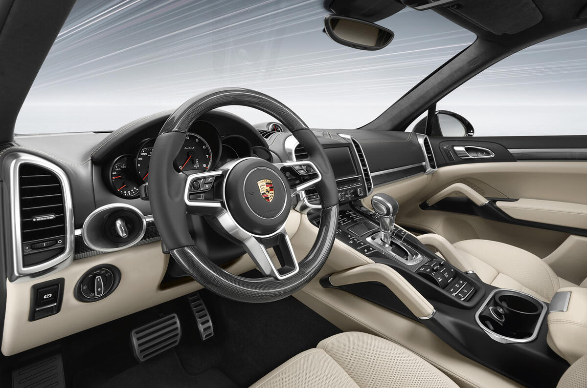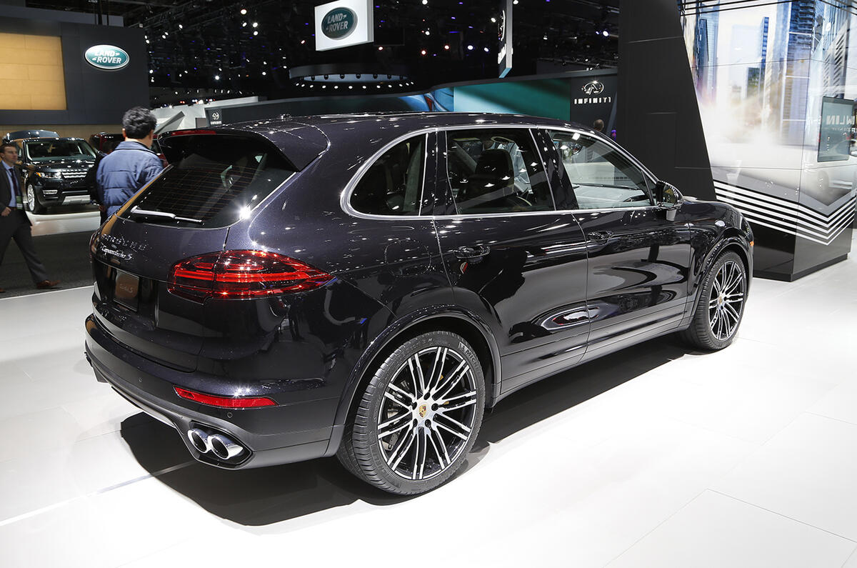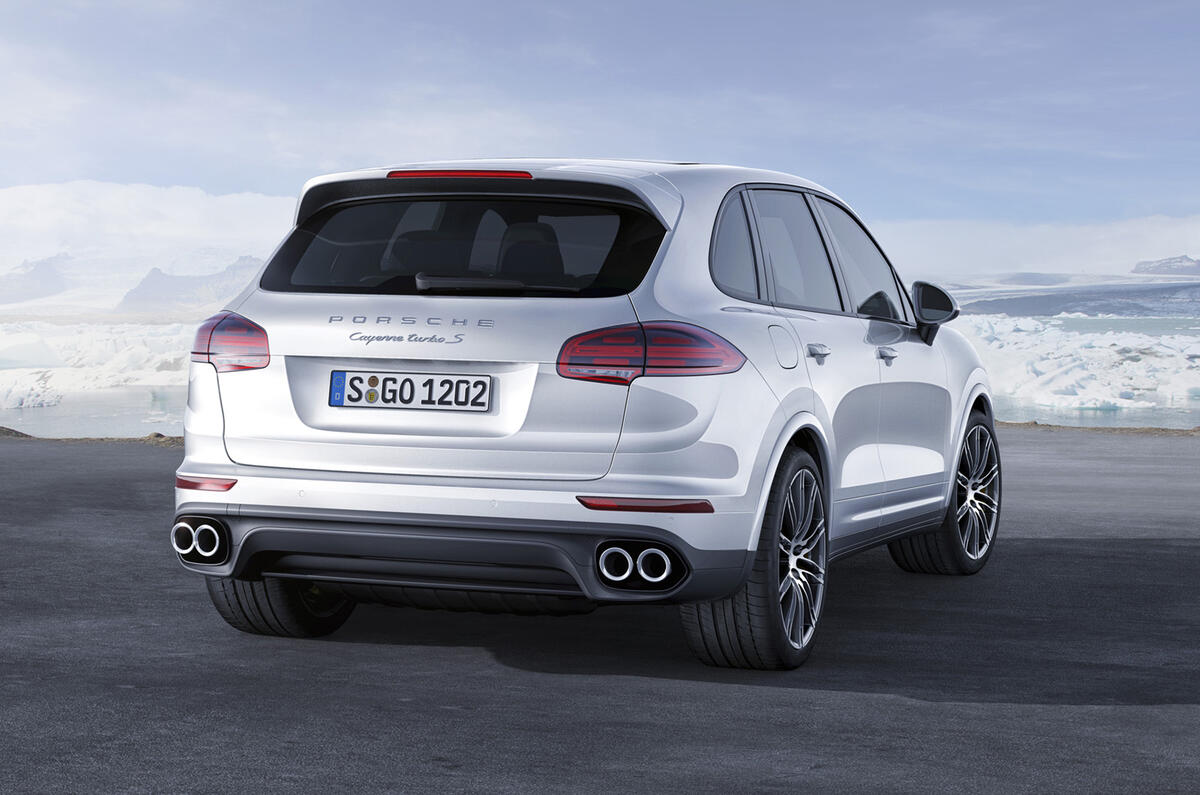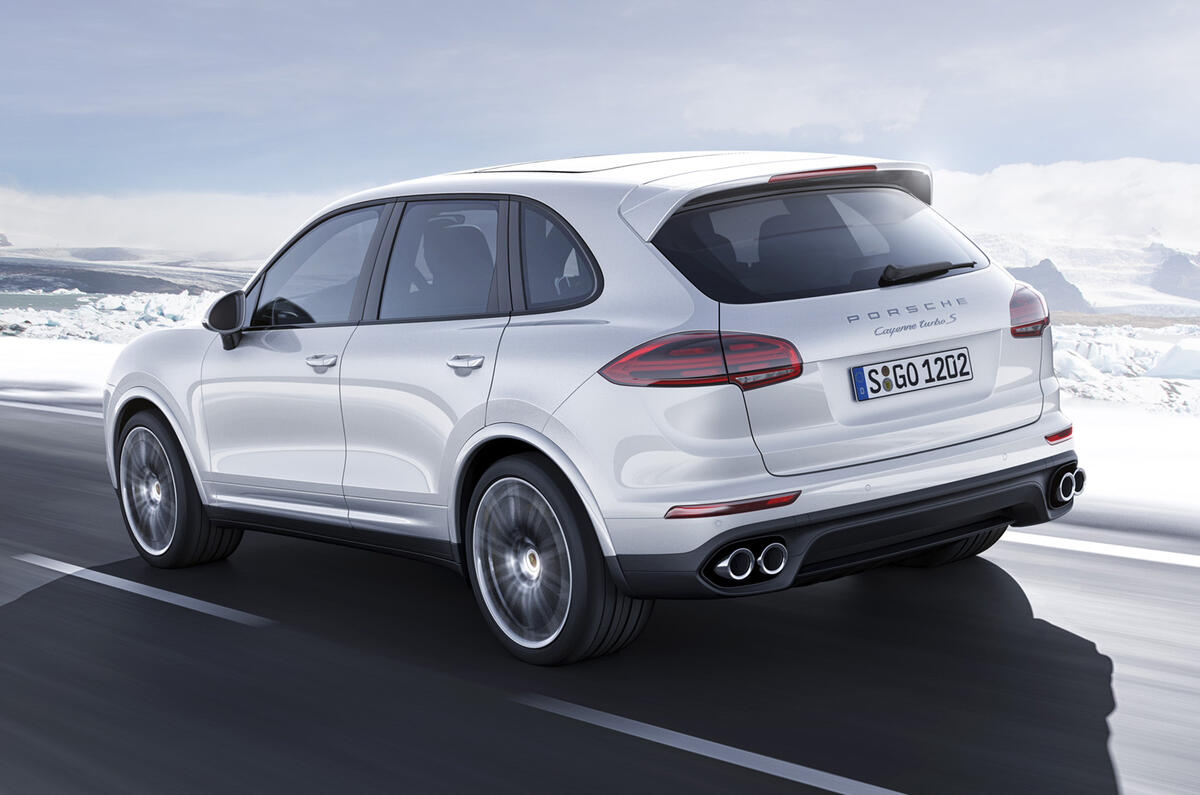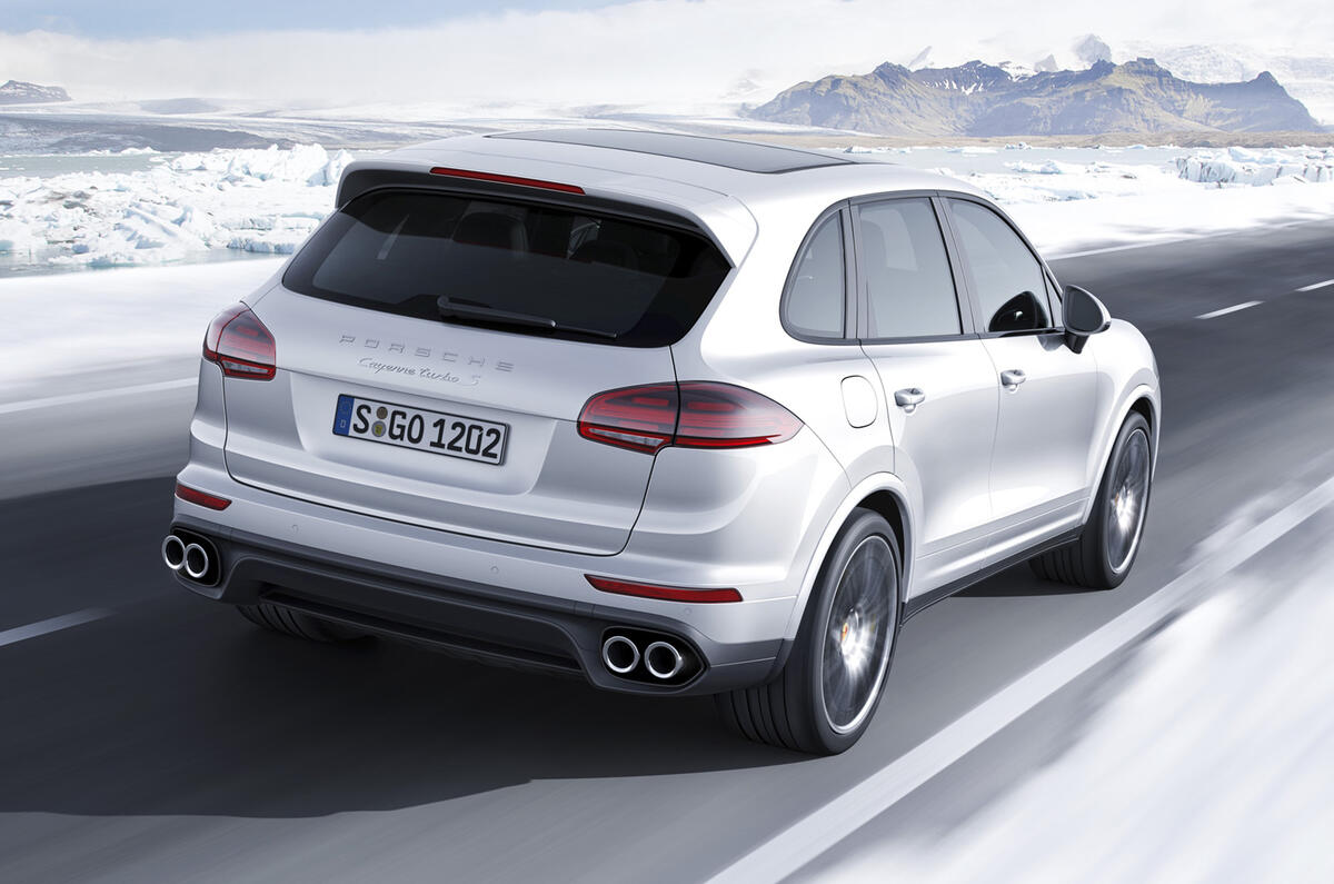 Distinguishing the Cayenne Turbo S from lesser Cayenne models are high-gloss black elements within the air ducts in the front bumper and lower part of the door mirror housings, along with body-coloured wheel arch extensions and a rear spoiler integrated in the upper part of the tailgate.