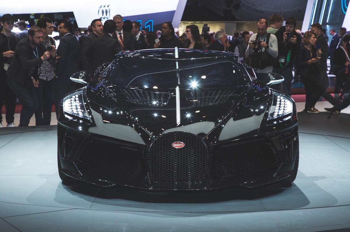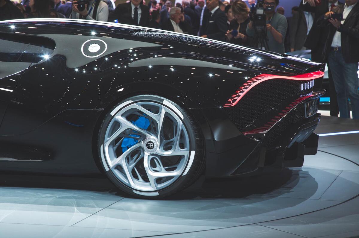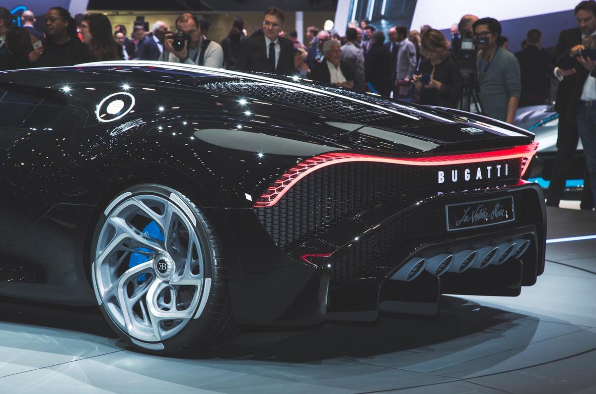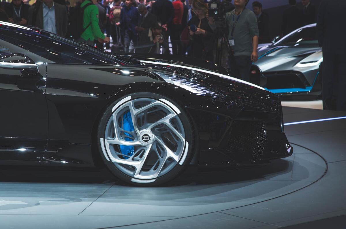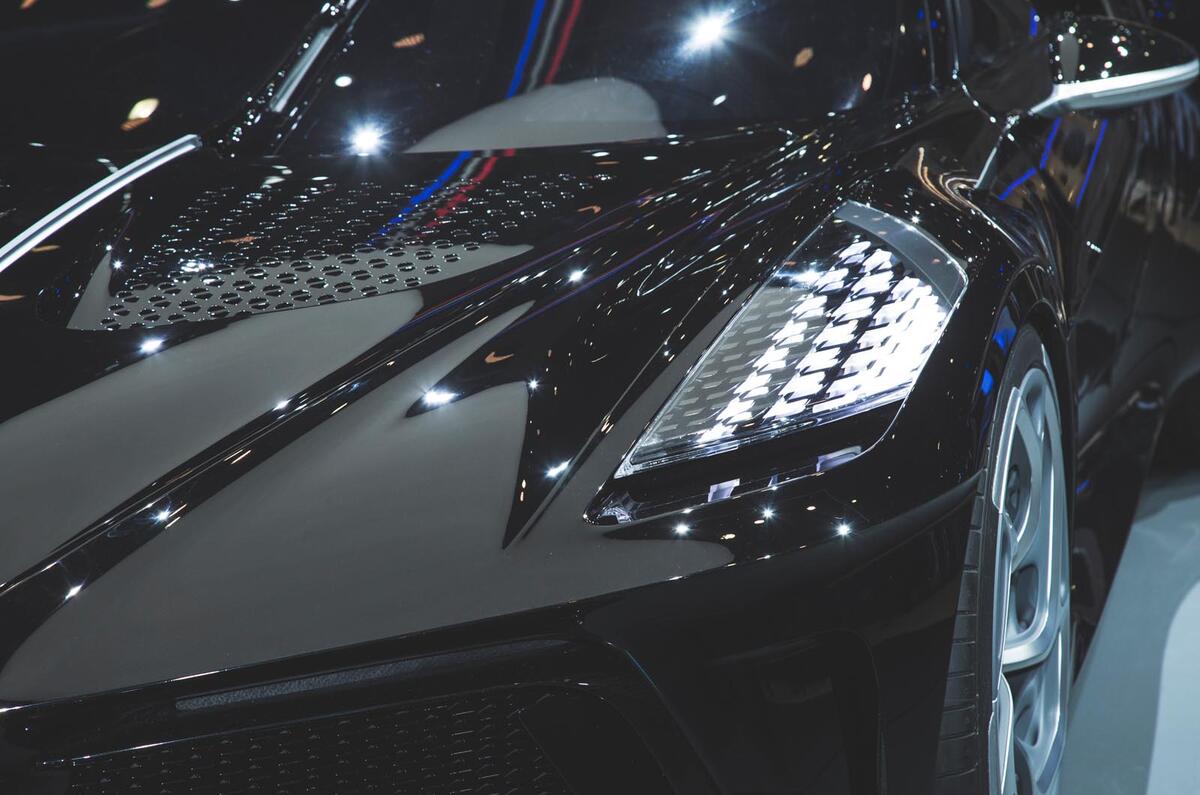 La Voiture Noire, which arrives in Bugatti's 110th anniversary year, features aggressive styling up front with a more pronounced grille than either the Veyron or Bugatti Chiron, while the headlights recede back above the wheel arches rather than being placed horizontally above the bumper, which now juts out sharply.