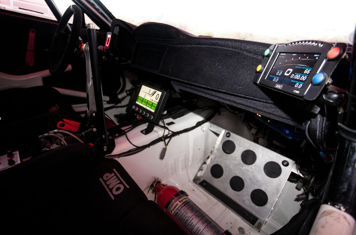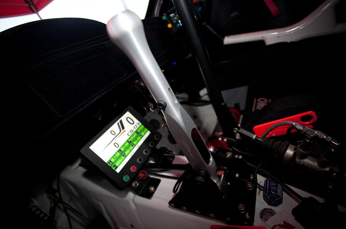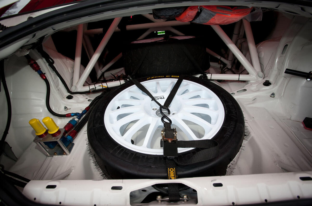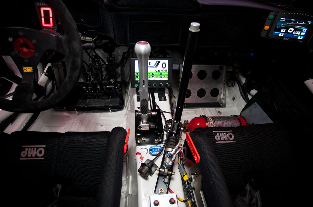 The car’s steel monocoque is largely unchanged, but a roof vent is applied because, like most of the rest of the interior, the air conditioning system has been torn out. In its place goes a homologated rollcage and not a great deal else, save for other essential safety gear and the instruments.