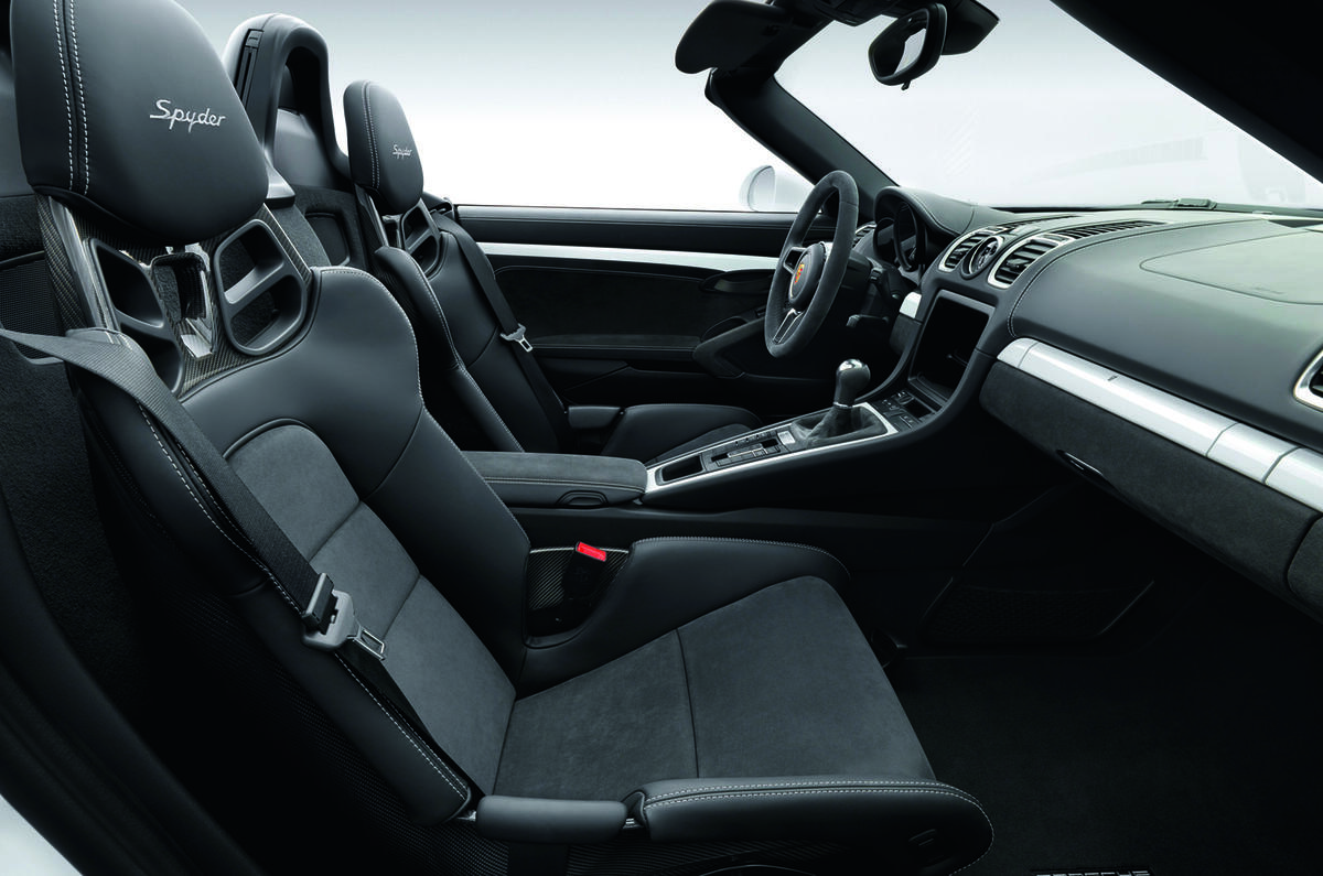 Inside, new lightweight sports seats are fitted with large side bolsters. There is also a new steering wheel, designed to ensure that the Boxster Spyder can be driven “precisely and with great agility”, according to Porsche.