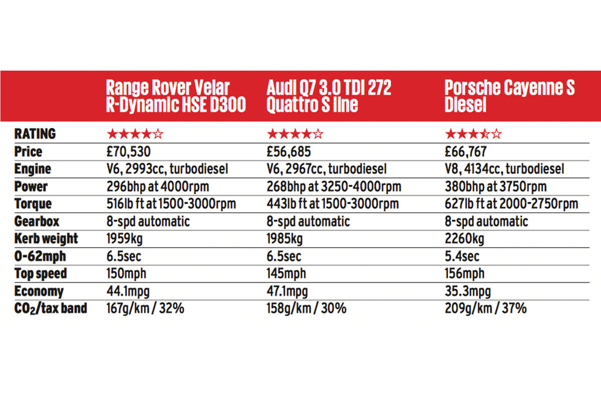 What rivals, though. For the £70,530 of our Velar R-Dynamic HSE D300 test car, you can have a Porsche Cayenne S Diesel and a little bit of change or an Audi Q7 3.0 TDI 272 quattro S line and quite a lot more change. You could have a Maserati Levante Diesel also – although Maserati wouldn’t lend us one â¨of those for this comparison.