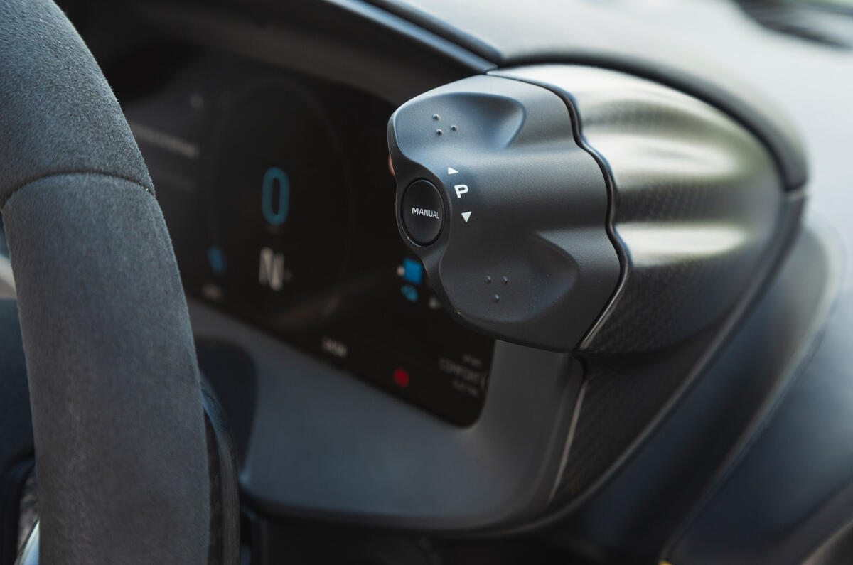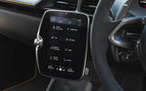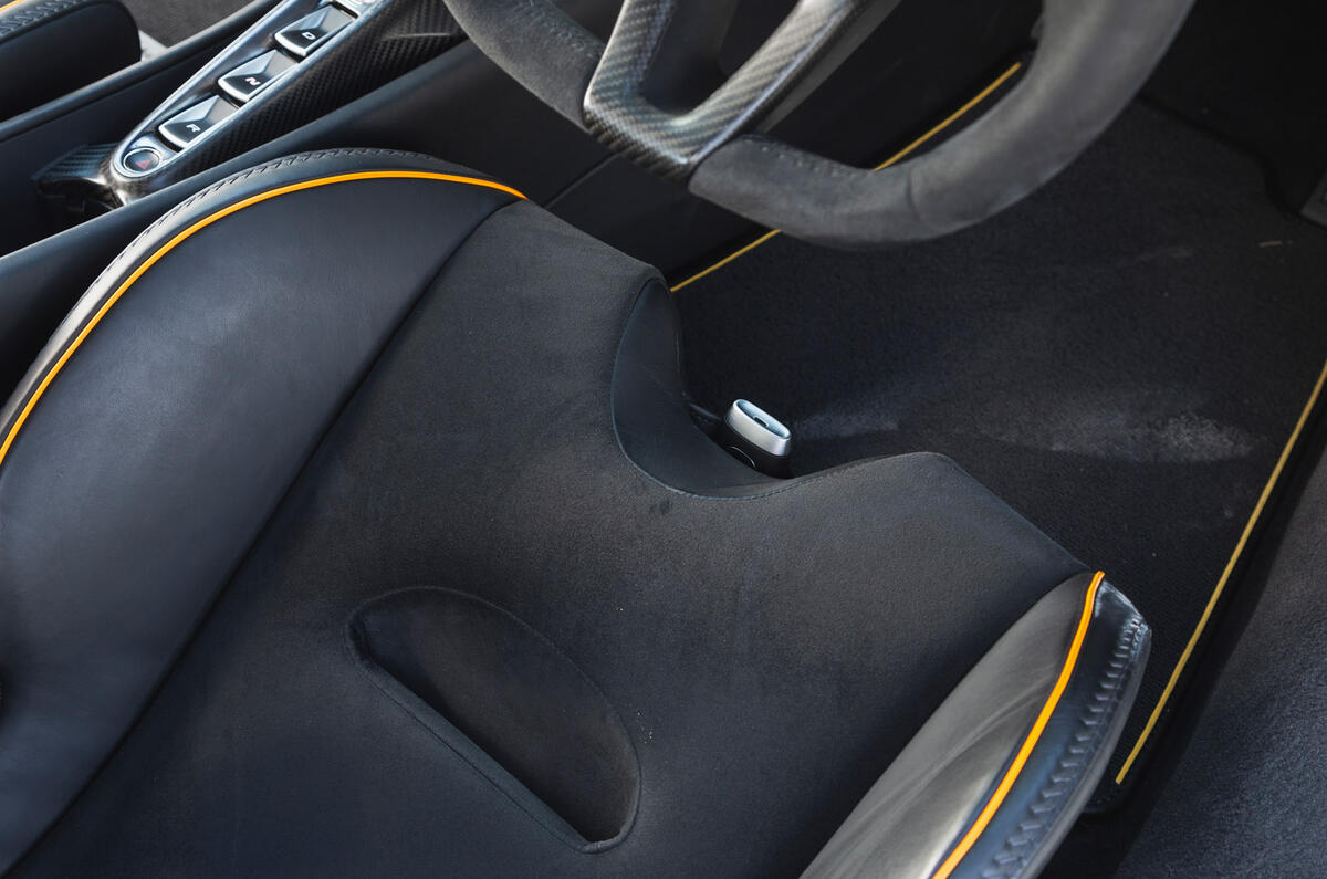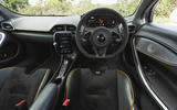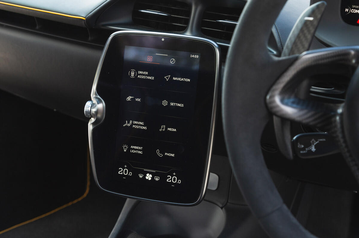 The car’s instrument screen is all-digital and all-new. In contrast to the one on the McLaren 720S, it is mounted directly onto the steering column rather than the fascia behind, so it moves with the wheel as you adjust the latter for your ideal driving position and – in theory – remains unobstructed by it. In practice, our taller testers found the column a bit short on upwards rake adjustment range, leaving the top 10mm of the screen itself obscured by the rim of the steering wheel.