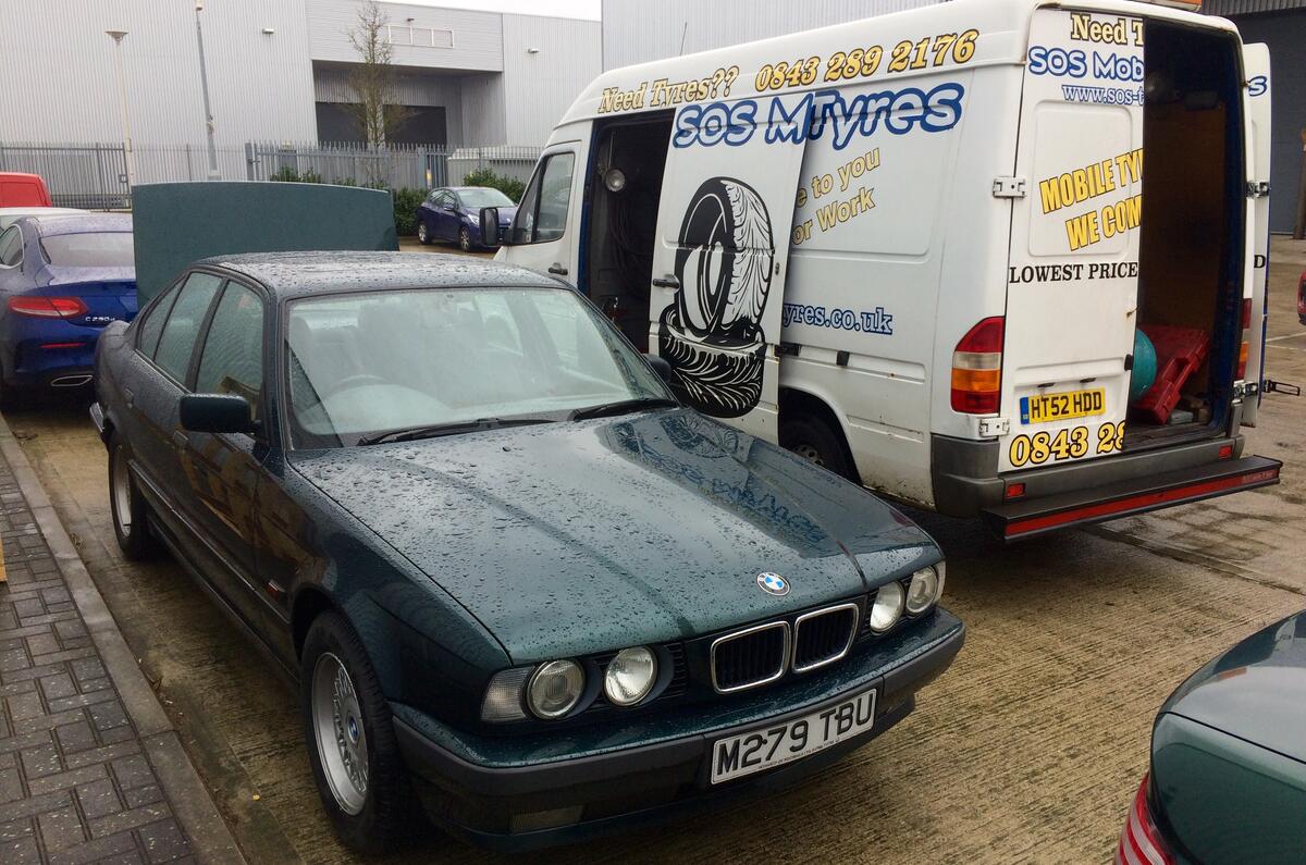If you remember, I'd already been fortunate enough to find a brand new alloy and tyre for just £30 in Dorset, so I stuffed three nearly new tyres (still on their alloys from another broken E34) in the car and drove home. A quick call to the same tyre fitter and £50 later, the E34 was properly shod.